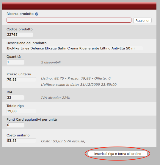 5) il modulo sarà automaticamente compilato con i dati del prodotto con una quantità pari a 1. E' possibile modificare ogni valore, tranne il totale riga.