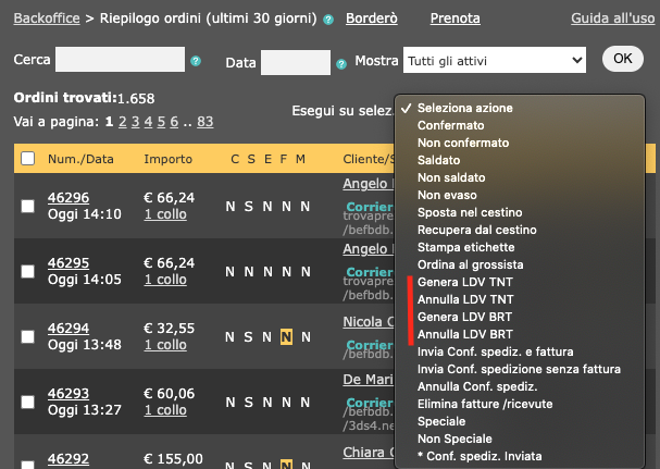 Per generare in un'unico file più spedizioni basta spuntare gli ordini interessati (che dovranno essere confermati, fatturati e saldati oppure in contrassegno) e scegliere dal menu a tendina Seziona azione: Genera LDV (Genera LDV BRT o anche Genera LDV TNT) in base alla scelta effettuata prima dell'installazione).