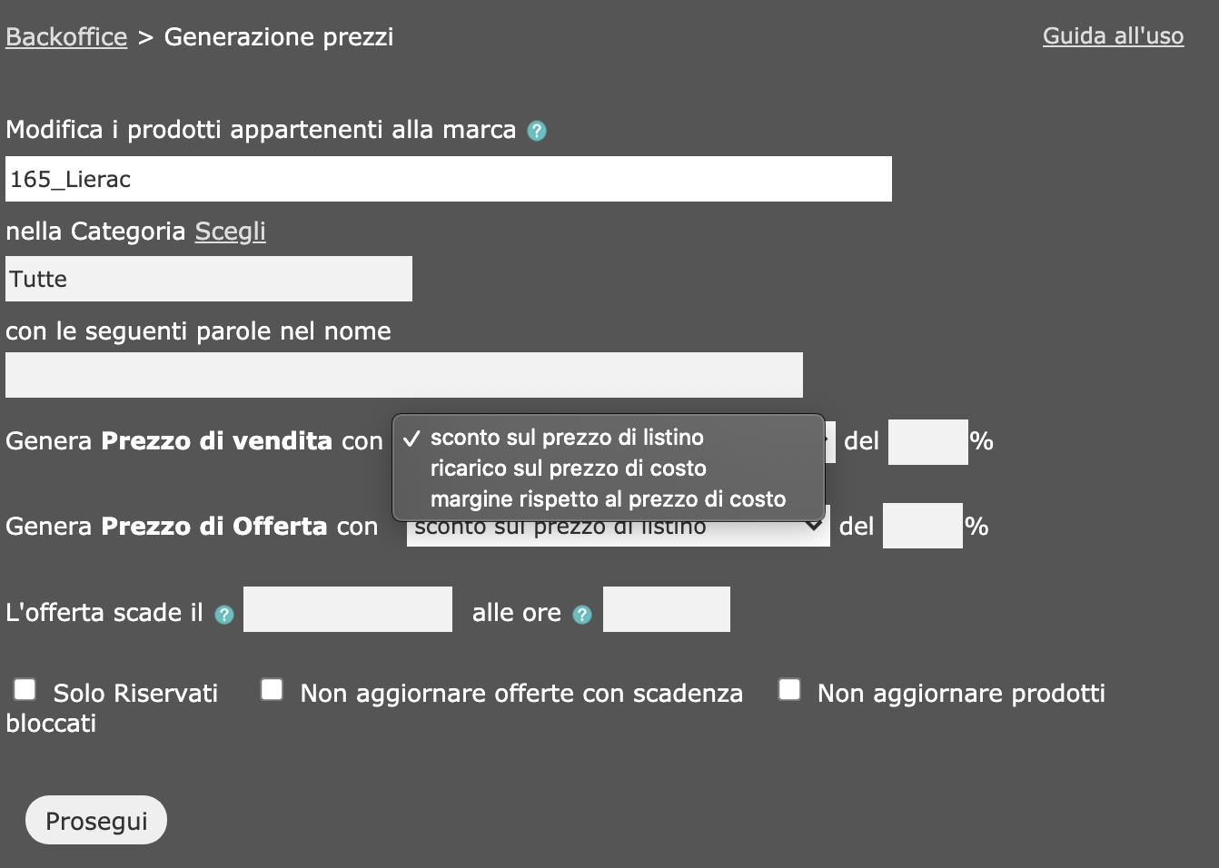 Per generare un prezzo di vendita o un prezzo di offerta è necessario selezionare dal menù a tendina l’opzione da impostare: uno sconto sul prezzo di listino oppure un ricarico sul prezzo di costo oppure il margine sul prezzo di costo.