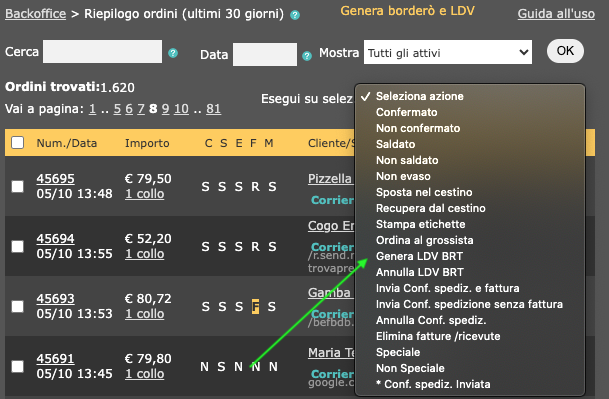 Per generare la Lettera di vettura sarà necessario tornare in Riepilogo ordini, selezionare il nostro ordine e cliccare Esegui su selez. > Genera LDV BRT.