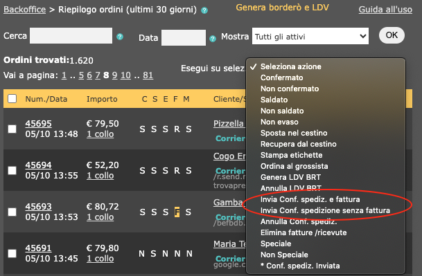 Una volte ottenuti gli ordini "evasi senza email", li spuntiamo tutti e selezioniamo “Invia conferma di spedizione e fattura” o "Invia conferma di spedizione senza fattura".